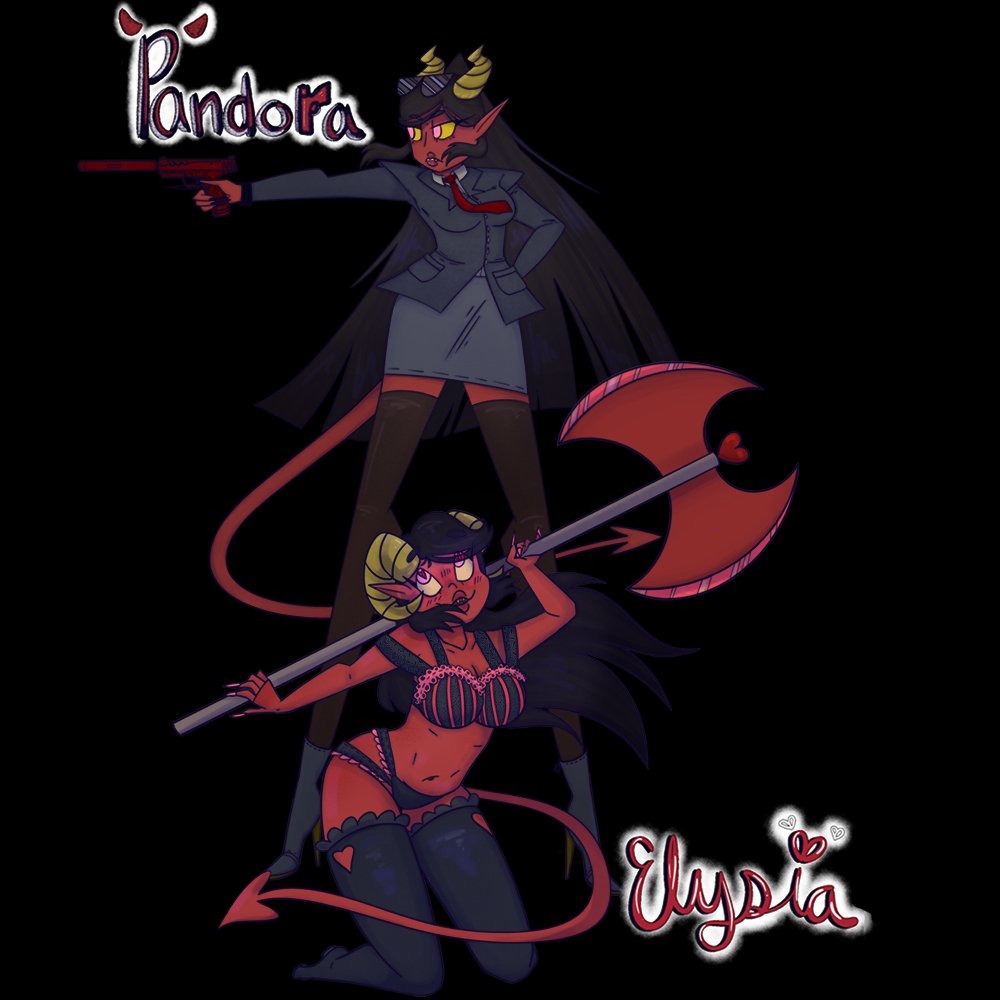 Pandora, the confident assassin, is strong, calculated, and driven in her decisions. She never does anything twice, as it's always done right the first time. Pandora's job is to carry out the logistics of a mission and steer her partner in the right direction in order to efficiently take out their target. Her true origins are unknown, as she has no recollection of a life before hell. The one thing she remembers in a vague pain in her chest, and a man's voice that said, "Come and find me." As a Succubus, she had to force her way through bounty hunting, to shatter the expectation that lower demons are weak. Pandora doesn't stop moving and sees no reason to stray from her ultimate goal: avenging her own death by finding her killer. However, as much as she doesn't want to admit it, Pandora has no idea what she's actually doing. She relies on Elysia to help motivate and guide her towards power. She never says it, but she truly loves and appreciates her partner.